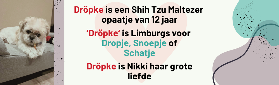 Ja zeker, ik heb zelf een super lieve hond en die heet Dröpke. Het is een Shih Tzu Maltezer en inmiddels een opaatje van bijna 12 jaar die heerlijk lui kan zijn. Hij gaat altijd met ons mee op vakantie en is een echte waterrat die met momenten graag in het zand speelt en graaft. Ik ben een mega fan van alle dieren maar mijn favoriet is en blijft toch wel een hond.