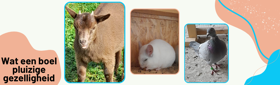 Hieronder zie je een van Mendy’s geitjes, haar chinchilla en één van haar 300 duiven.