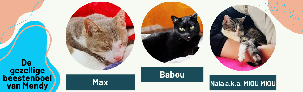Ik heb 3 katten, 1 chinchilla, 8 geiten, 3 kippen en 300 duiven. Op de foto hieronder zie je Mendy’s 3 katten: Max, Babou en Nala. Mendy noemt Nala meestal: ‘Miou Miou’ omdat ze een échte kletskous is, ze miauwt heel veel.