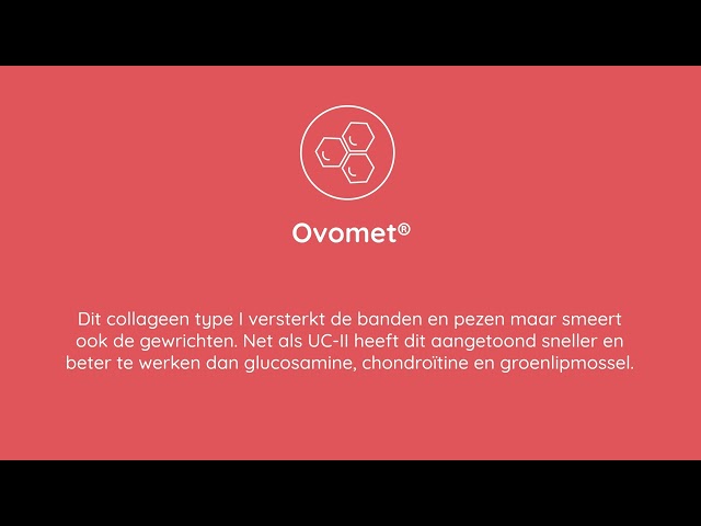- Collageen type I (Ovomet®): versterkt niet alleen de banden en pezen rond de gewrichten, maar “smeert” ook de gewrichten. Het wordt gewonnen uit het vlies van eierschaalmembranen en is een natuurlijke bron van collageen, hyaluronzuur en chondroitine sulfaat.